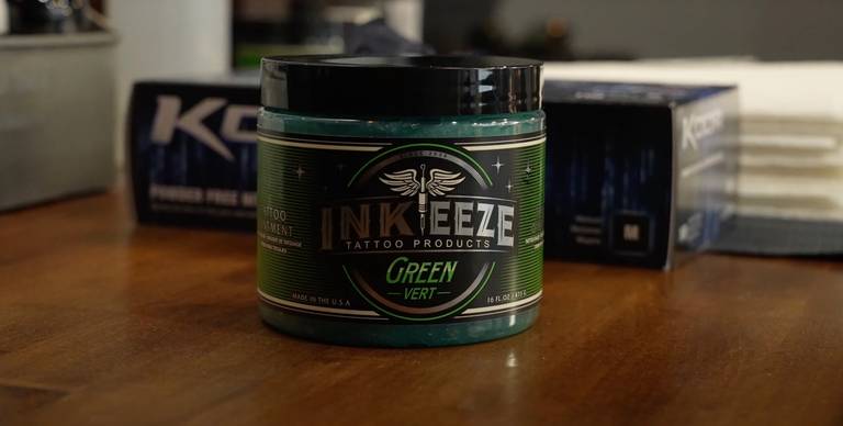 MAŚĆ: Maść do tatuaży Inkeeze Green specjalnie stworzono z zawartością witamin A, C i E, a także wyciągów roślinnych do użycia podczas wykonywania nowego tatuażu i pielęgnacji skóry po jego wykonaniu.